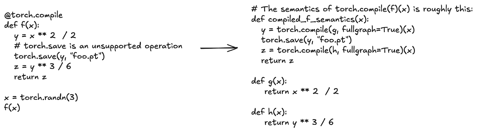 Figure 3: torch.compile captures straight-line graphs of Tensor operations and works around unsupported operations like torch.save.