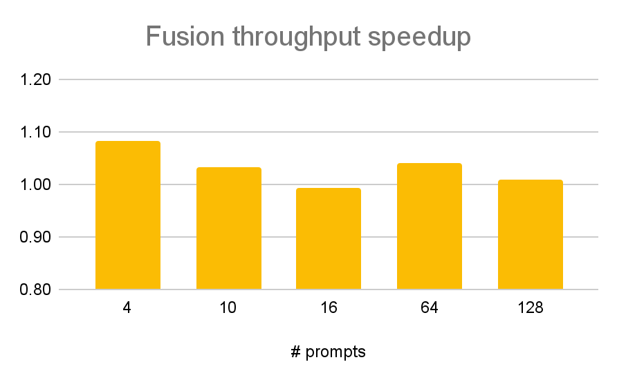 Figure 7: On Llama 3.1 405B quantized to FP8, tested on 8x AMD MI300s, fused kernels (fusion, in yellow) outperformed both default (using torch ops for RMSNorm and SiLU and custom FP8 quant kernel) and custom (unfused custom kernels).